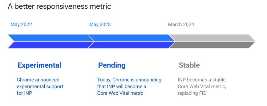 Google announced a new Core Web Vital called Interaction to Next Paint (INP)just over a year ago (May 2022) designed to be the first metric to measure responsiveness accurately. INP has been moved from Experimental to Pending status.