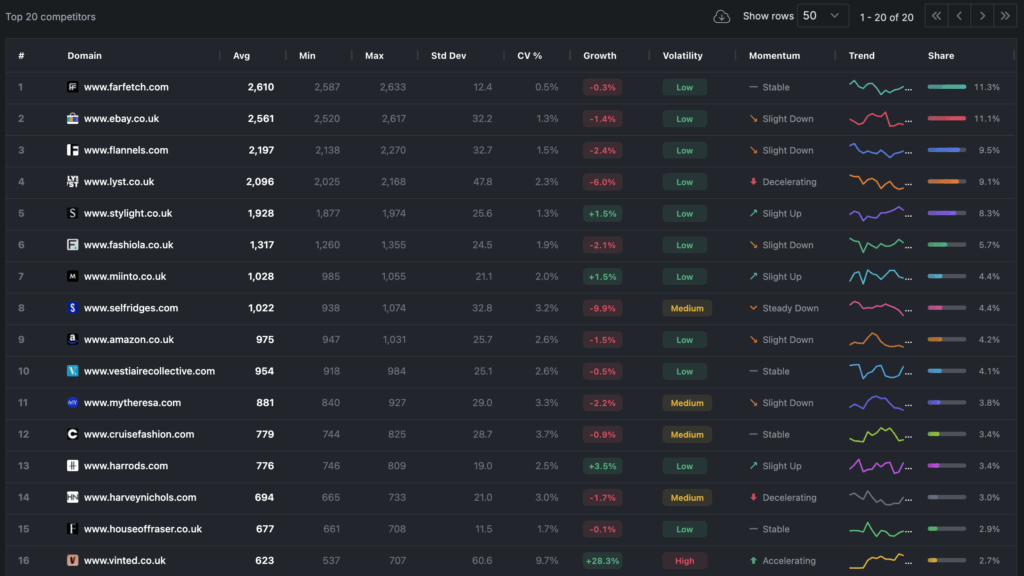 The default depth is the top 20 domains on the SERPs but going deeper is just a click to get a leaderboard of the top 50 domains.