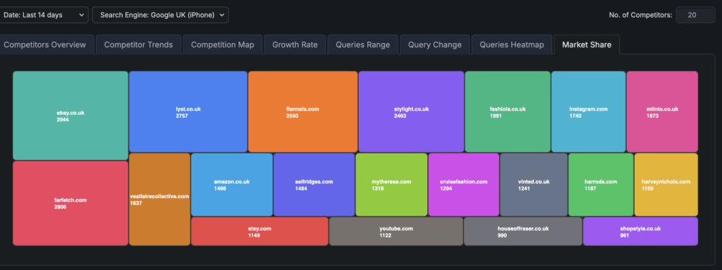 In addition to the bubble chart showing the competing domains by query and growth rate, another favorite view is the market share heatmap.